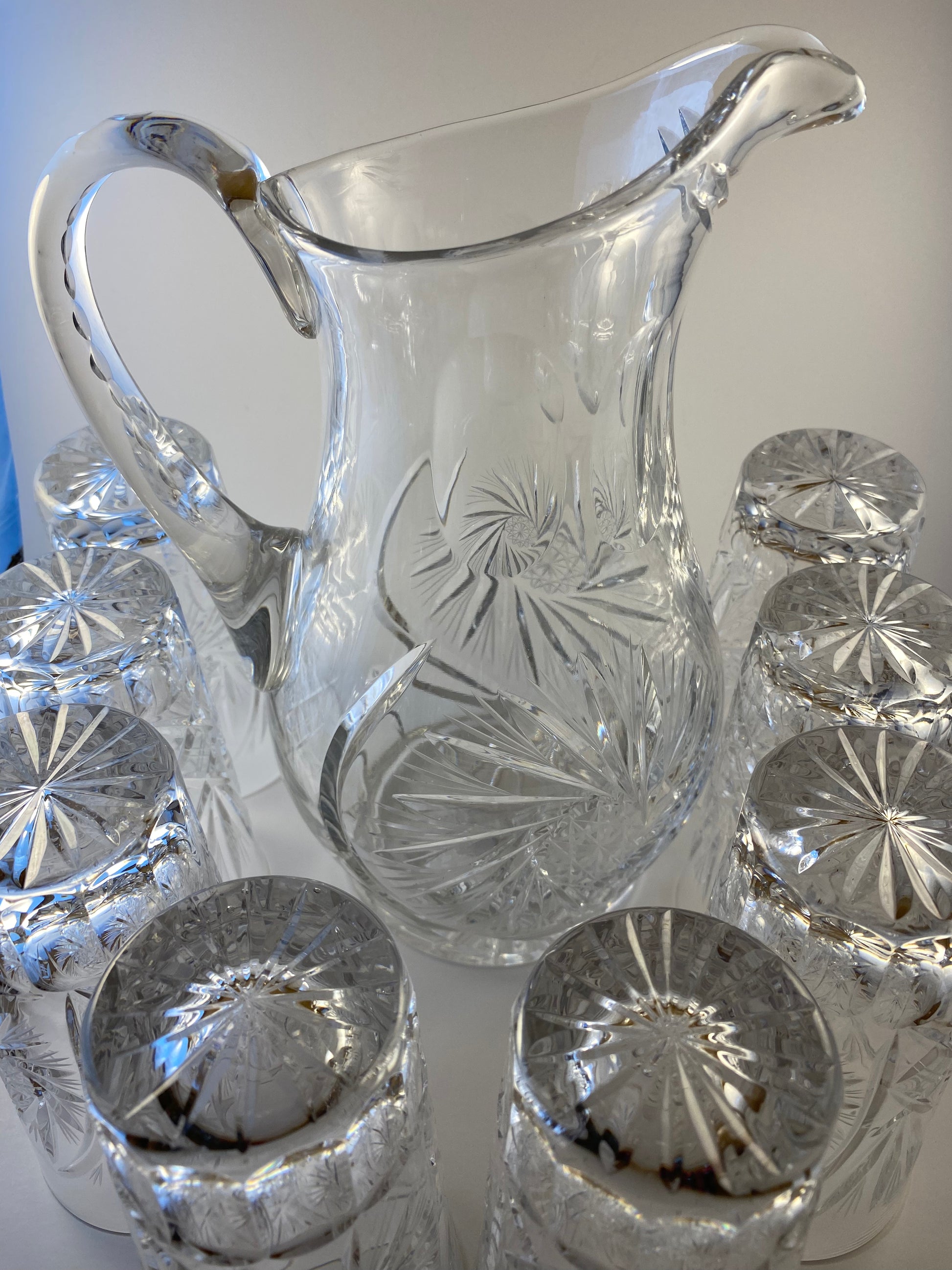 This is a very rare and beautiful set of cut glass. Pictures do not do it justice. Stun your guests with the beauty of this piece! Pitcher holds 48 oz and glasses hold 10 oz.