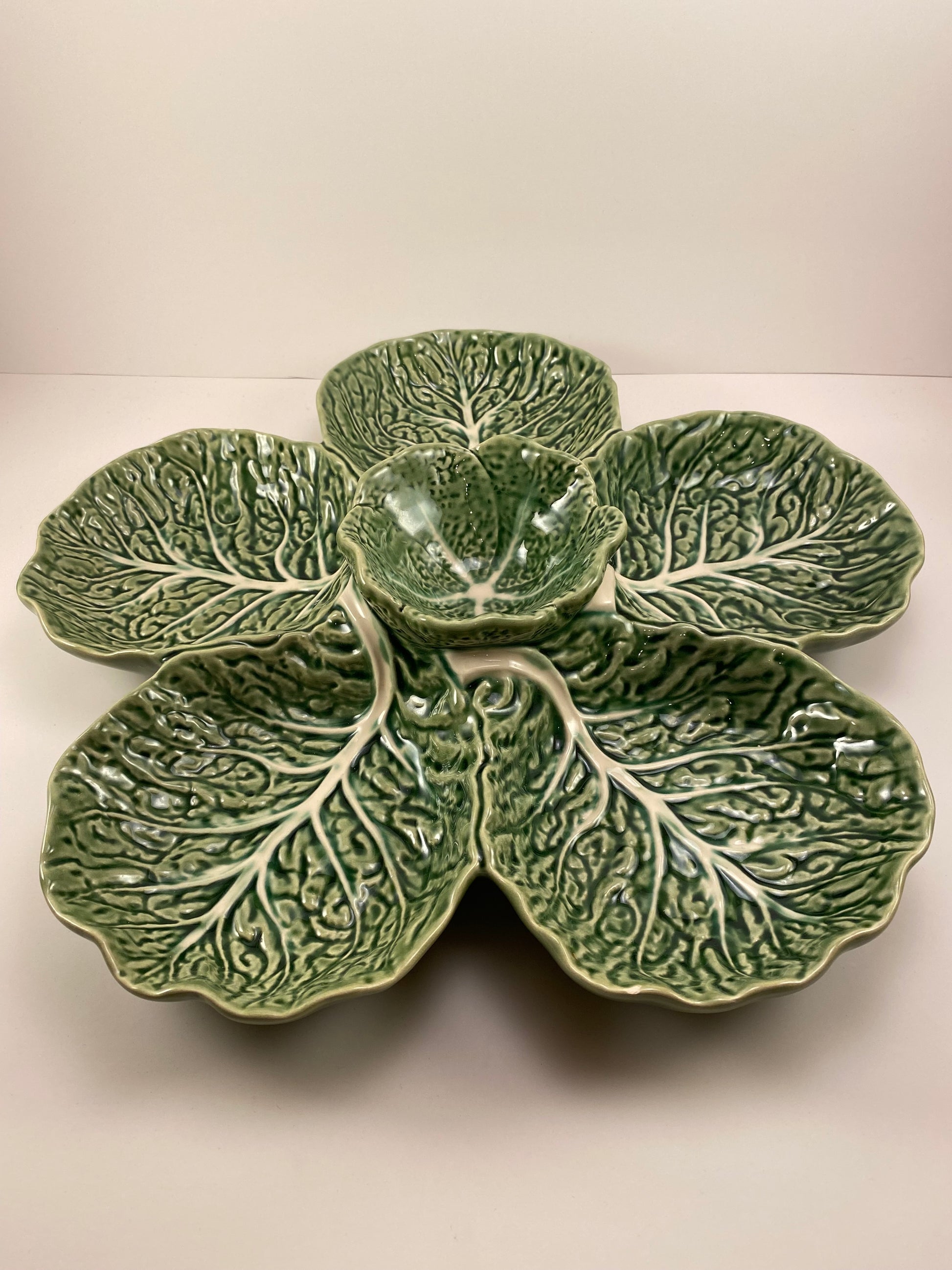 A one-piece majolica style, embossed ceramic, cabbage leaf vegetable tray with a center leaf bowl surrounded by 5 leaf bowl sections. The leaves are hand painted in a fresh green glaze with white veins, and has a gloss finish. It measures approximately 15" in diameter and is 3" tall. It is in very good condition, no chips, cracks or crazing. The dish has the round Bordallo Pinheiro makers mark and "Made in Portugal", stamped in black on the bottom. FREE SHIPPING!