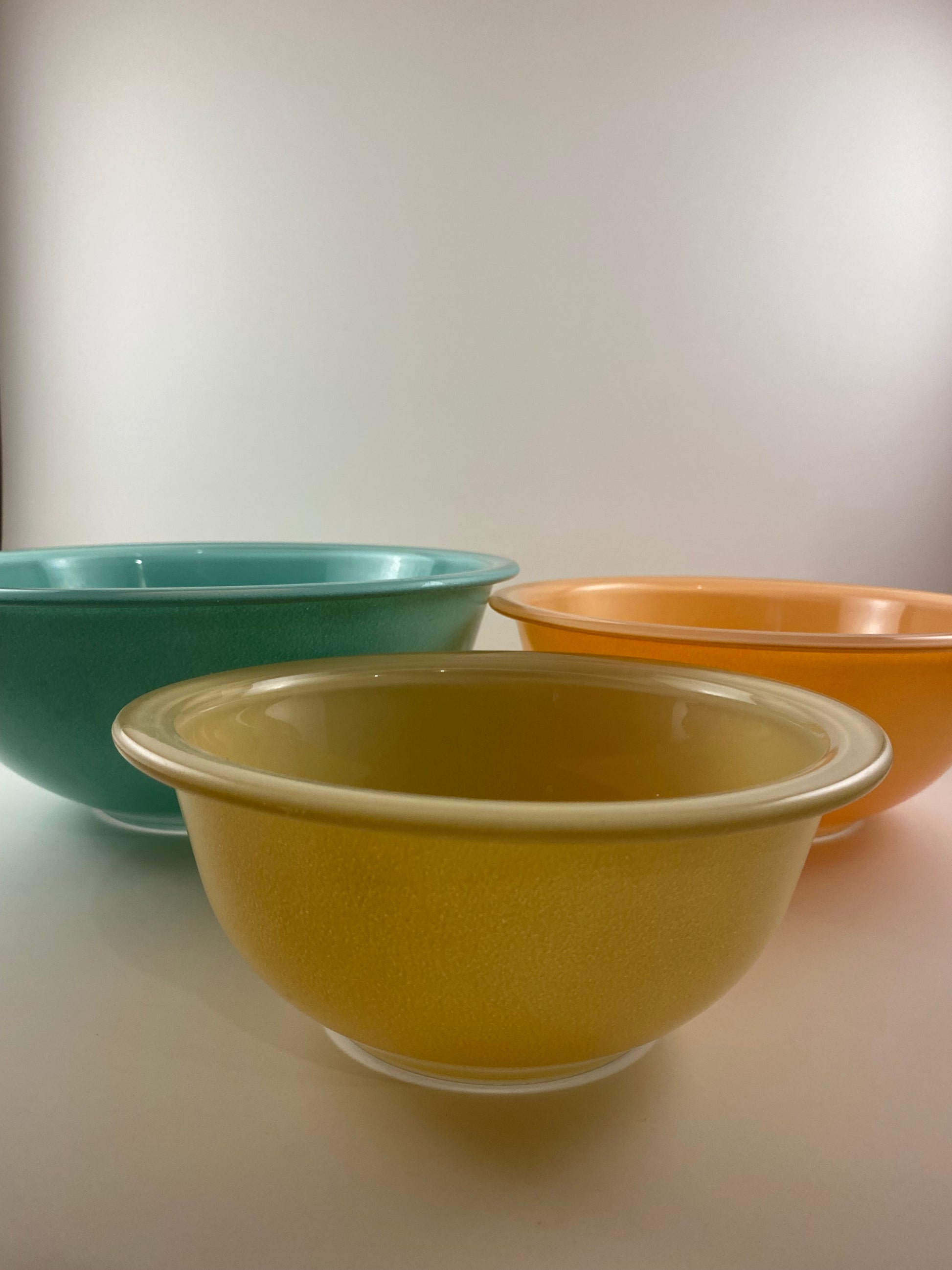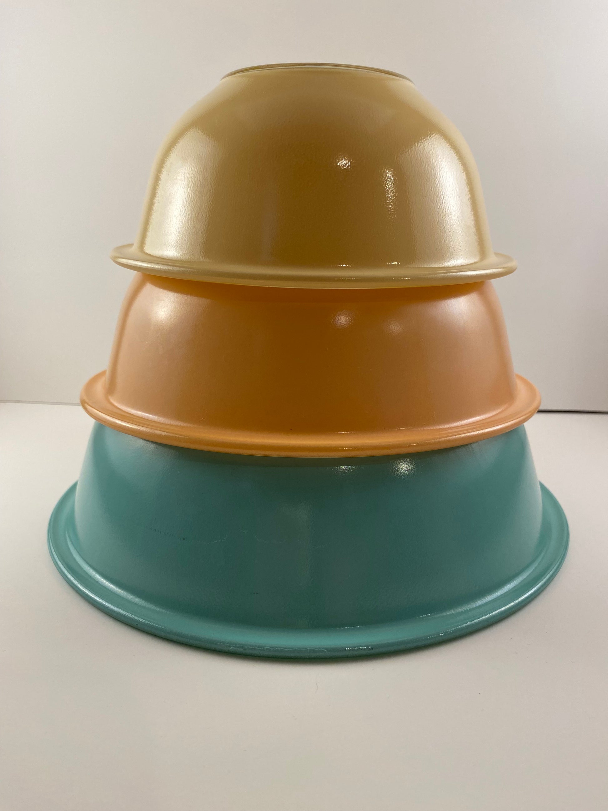 This listing is for a set of 3 Pyrex pastel color nesting bowls with clear bottoms. All bowls have some light scratches or paint wear, most noticeably on the peach and green ones. No cracks or chips.