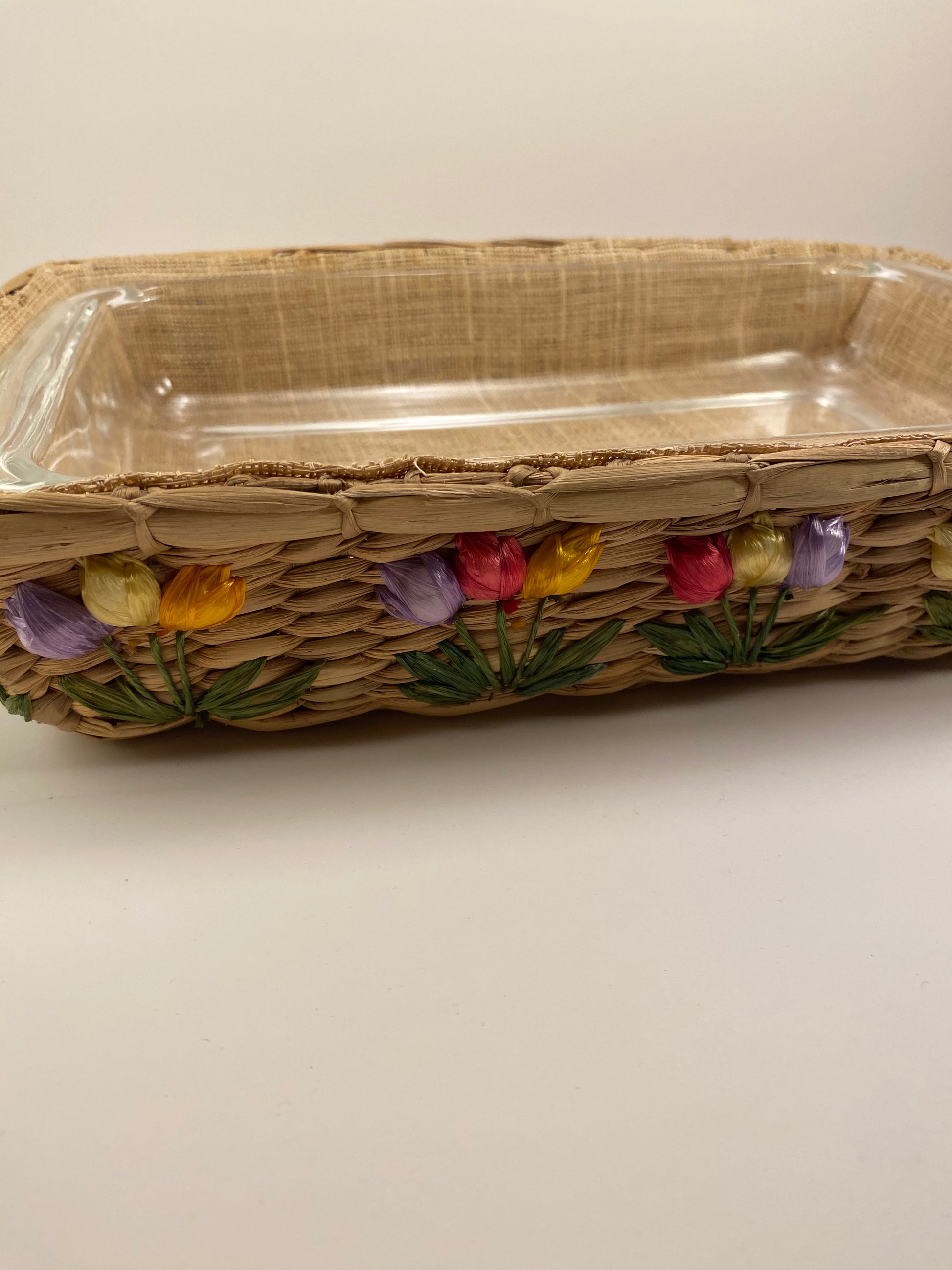 Adorable tulip pattern raffia wicker casserole Cartier with Pyrex casserole dish. In excellent condition for vintage! FREE SHIPPING on all items